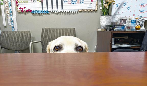 Diesel peeks over the desk of Mora Gills-Collins at the 19th Judicial District Courthouse.