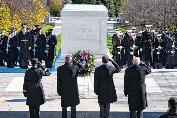 President Donald Trump, right, salutes during a wreath-laying ceremony at the Tomb of the Unknown Soldier at Arlington National Cemetery on Tuesday in Arlington, Va. After he addressed an audience in the amphitheater by saying, ‘Today, to every veteran — we love our veterans — we say the words too often left unsaid: Thank you for your service. Thank you.’