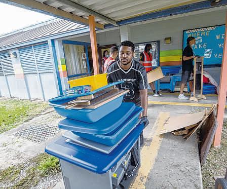Volunteers Raquel Zenon, left, and Makhi Carnell load a frozen turkey and Thanksgiving meal basket into a waiting vehicle on Saturday.