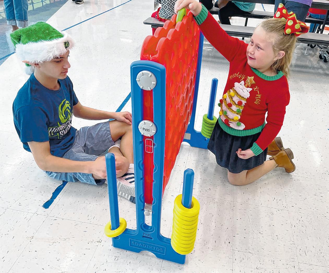 Six-year-old Elise Langlois, of Prairieville, plays Connect Four with Prairieville High School freshman swimmer Grant Boudreaux Nov. 15 during Donuts with Santa. The event is the swimming teamās main fundraiser