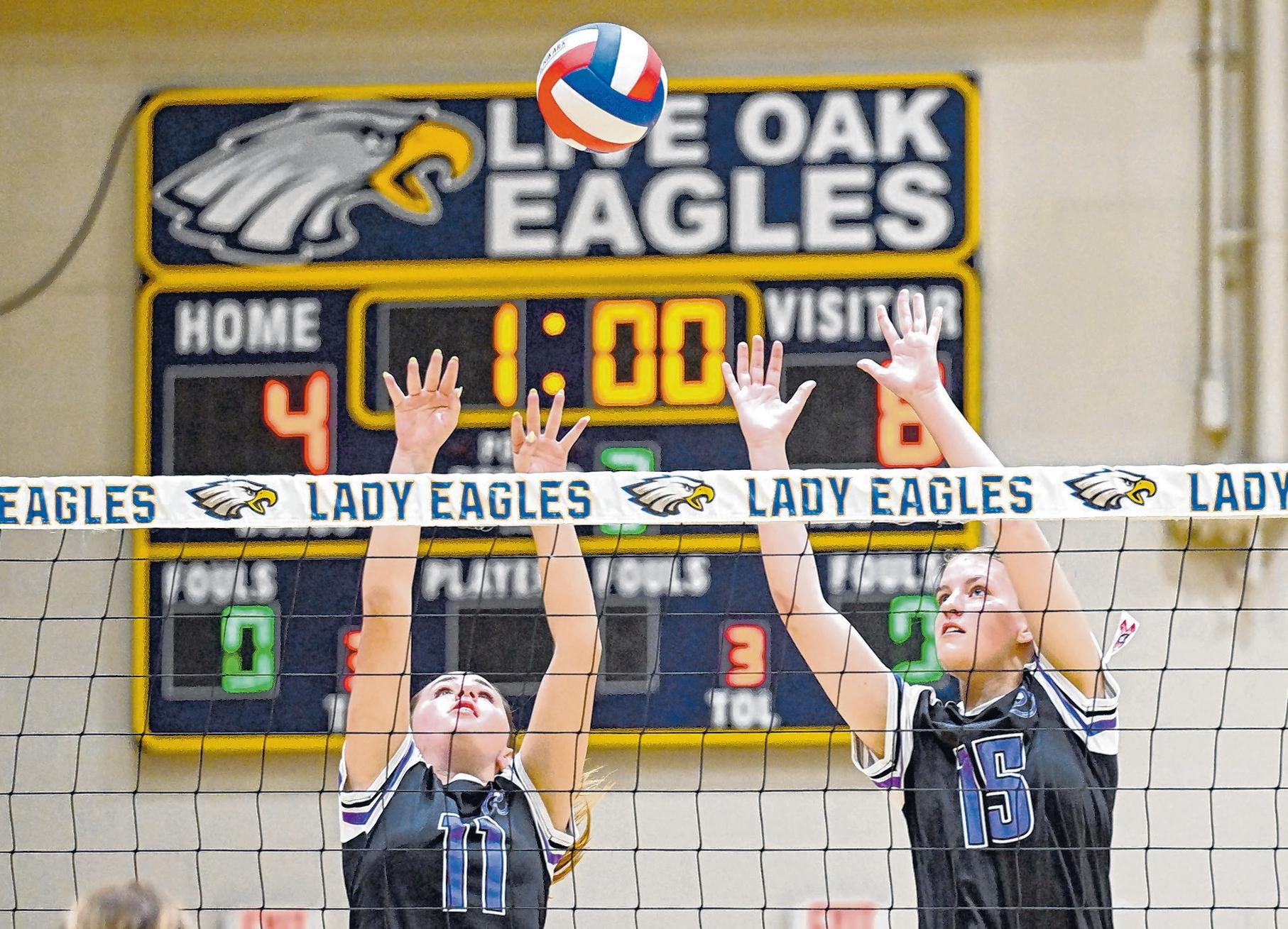 Dutchtownās Brynn Gonzales (11) and Hayden Herring (16) leap up to block the ball during the Live Oak vs Dutchtown volleyball game at Live Oak High School on Oct. 28.