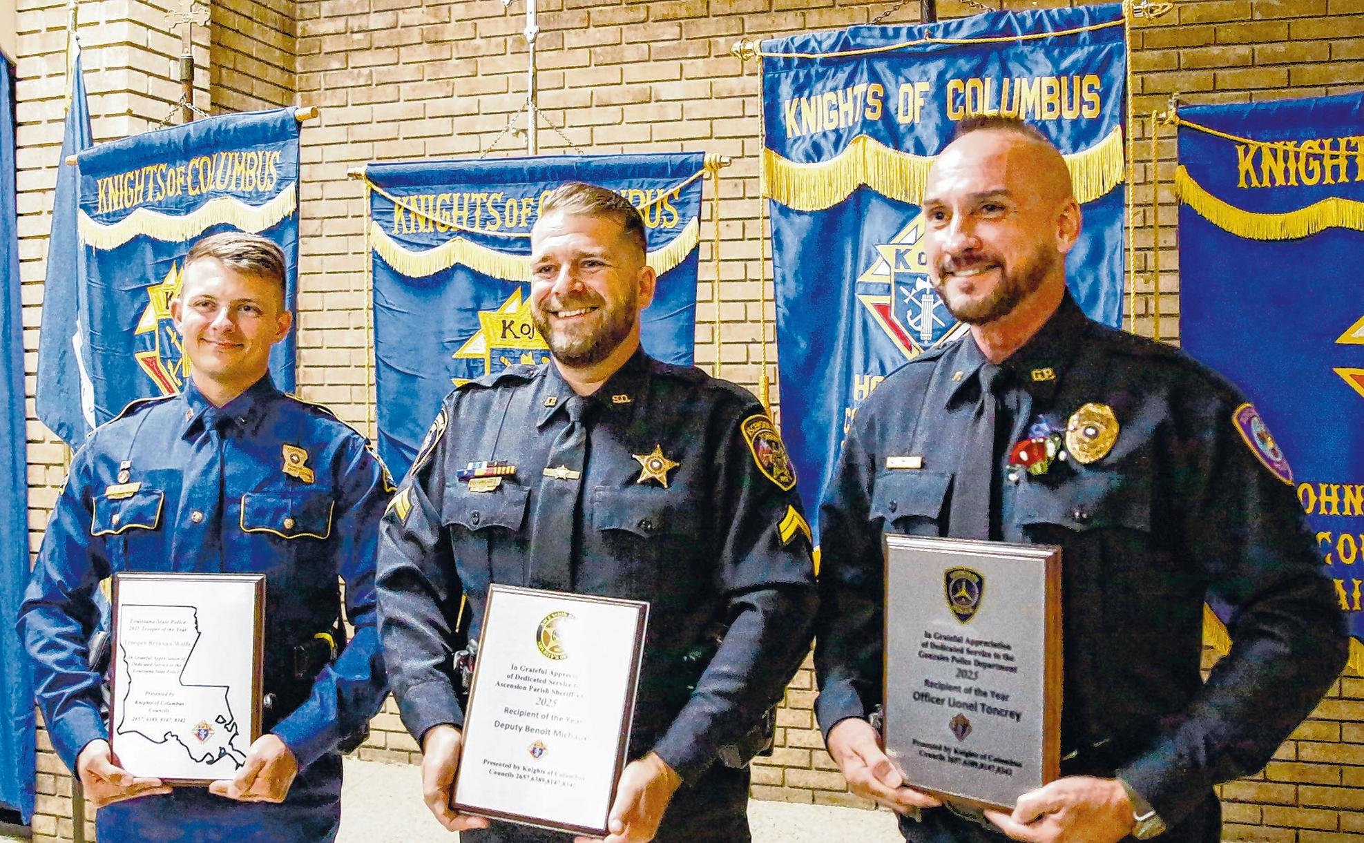 Honored by the Knights of Columbus as law officers of the year, from left, are Louisiana State Police Trooper Brennan Wolfe; Deputy Benoit Michaux, Ascension Parish Sheriffās Office and Officer Lionel Toncrey, Gonzales Police Department.