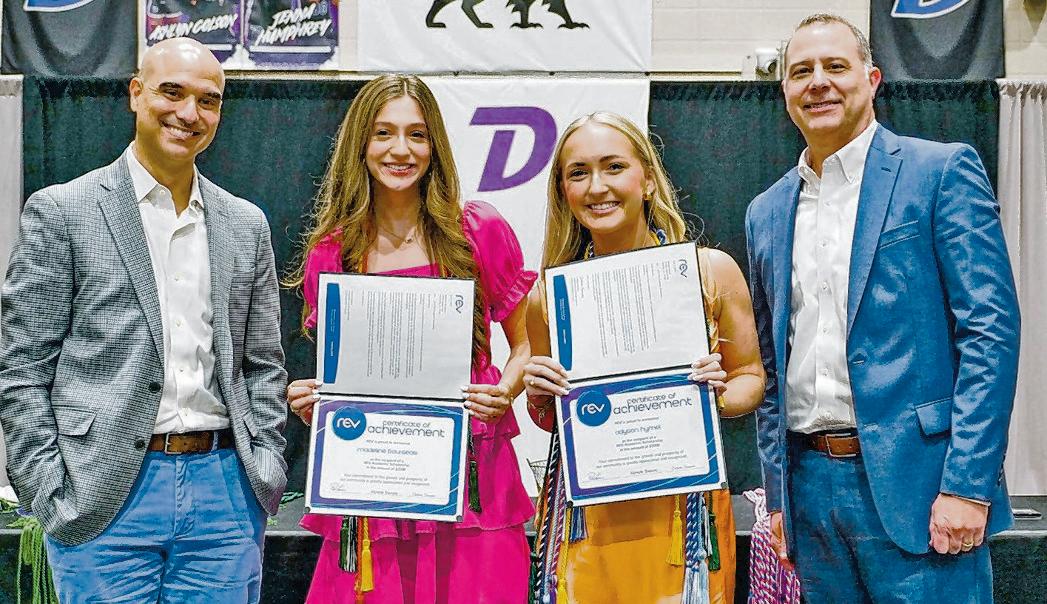 Dutchtown seniors Madeline Bourgeois and Adyson Hymel are presented scholarships by Jeremy Theriot, left, REV’s community relations and business development director, and Monte Danos, REV’s growth, strategy and product development director
