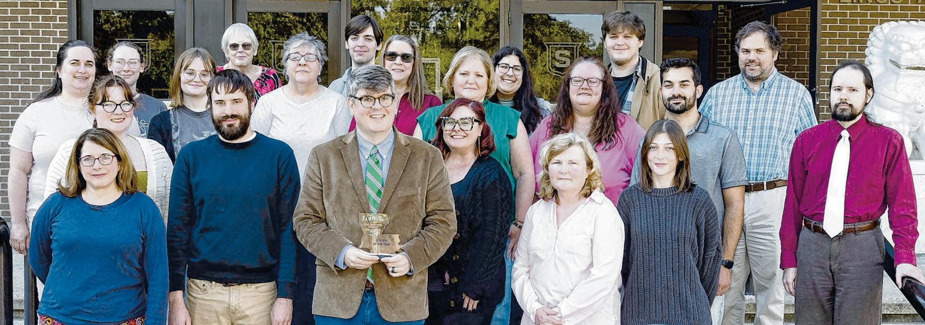 Library has been selected by LOUIS as the Louisiana Academic Library of the Year Sims Library Director David Sesser, center, holds a plaque with members of the library staff.