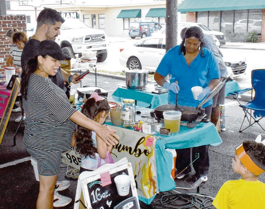 Andrew Reyes, left, buys a bowl of gumbo from vendor Jule Dumons while visiting the Hammond Farmers and Artisans Market on Nov 22 with his wife, Florda, and children Elliena and Camilo. Dumons’ wife, Janelle Dumons, is pouring the gumbo into a cup.