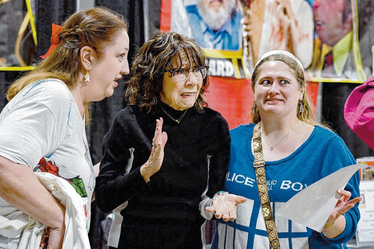 Mother and daughter Sherri and Gabby Montagnino make silly faces while taking a photo with actress Mindy Sterling