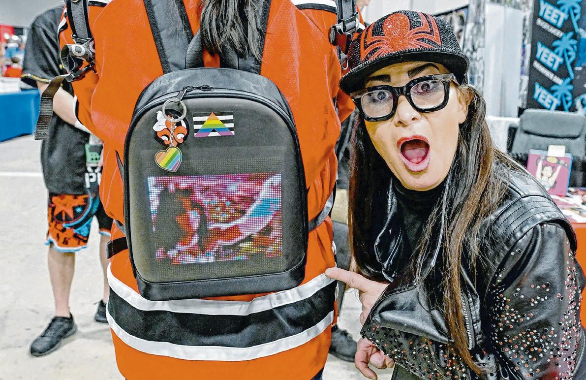 Wrestler Victoria excitedly poses with a photo of herself displayed digitally on fan Sherry Ervin’s backpack.
