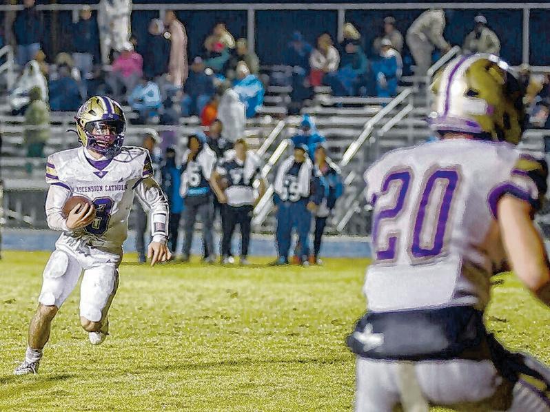 The Ascension Catholic offensive line opens up a hole for Trevin Simon to break for yardage.
