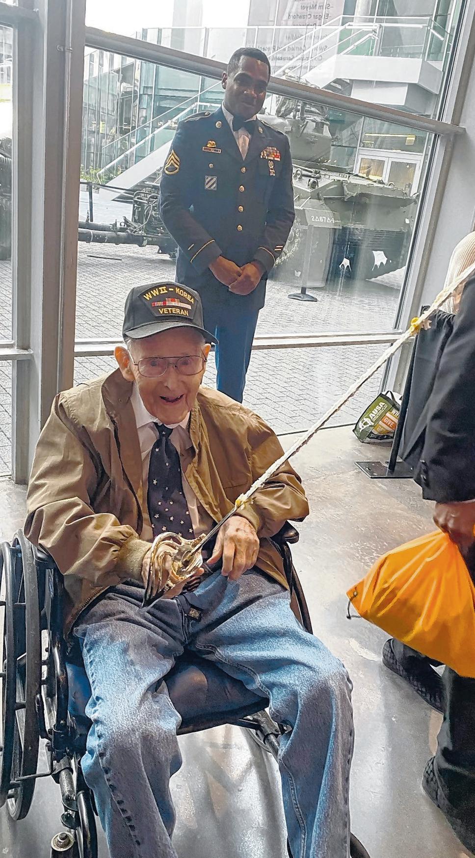 WWII veteran James Robinson, of Covington, holds a saber