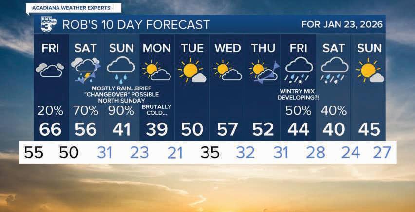 An extreme cool-down is expected overnight Saturday into Sunday, the weather service said. The chance for ice accumulation and freezing rain has decreased but is still possible. How far south the ice will reach in central Louisiana remains in question.