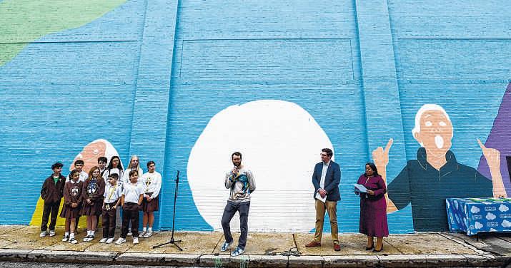 ABOVE: Artist Dirk Guidry, center speaks before the first paint strokes on the recently commissioned Children’s Museum of Acadiana mural at the museum on Thursday. To officially kick off the project, children from CathedralCarmel School were invited to paint the mural’s ceremonial first stroke.