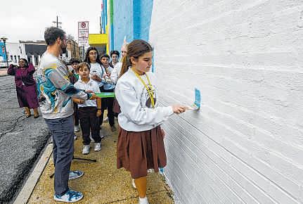 RIGHT: Art student Elise Sims, center, from Cathedral-Carmel School, paints one of the mural’s ceremonial first strokes.