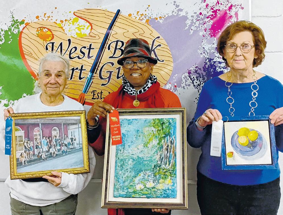 The West Bank Art Guild’s winners in the January 2026 meeting are, from left, Penelope Baker, ‘Gang Watchers,’ first place; Maria Victoire, ‘Nenuphars,’ second place; and Darlene Johnson, ‘Blue Plate,’ third place.
