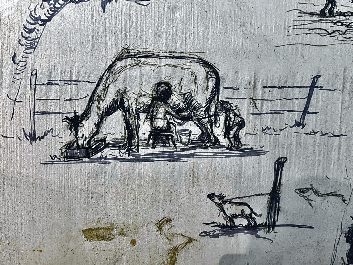Steele Burden’s drawing of a farm worker milking a cow is one of many he sketched on the LSU Rural Life Museum’s barn walls to tell the story of daily life on Windrush Plantation, which is