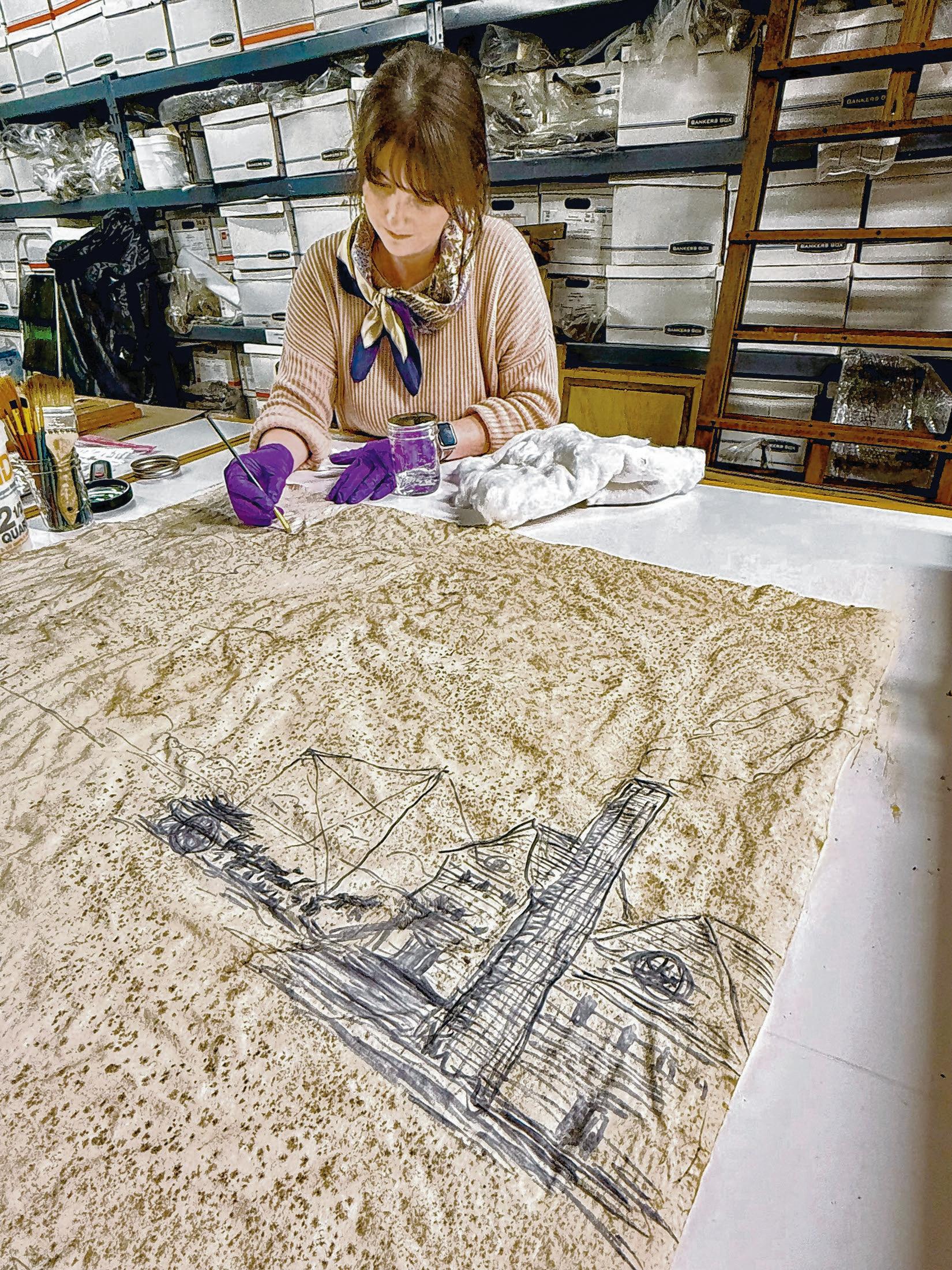 “It’s brittle and old, and the adhesive isn’t exactly what it used to be,” Dauterive said. “So, I went out there with a mask, protective glasses and something covering my clothes, and I just picked up a drawing from a palette and started scraping it. Then I started peeling it back until the backing came completely off. I was able to use the acetone to melt the adhesive completely away from the drawing.”