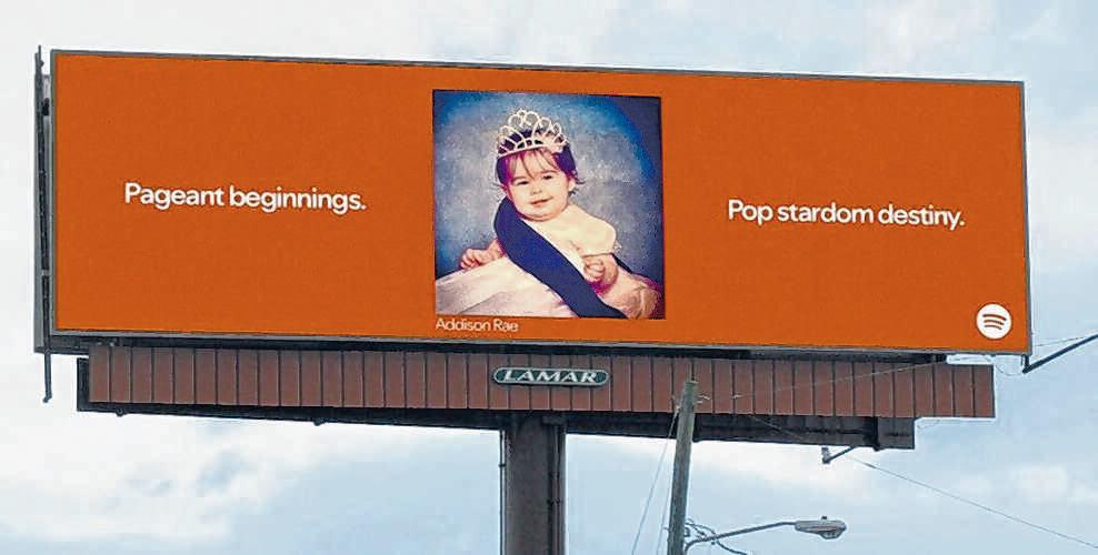 A Spotify-sponsored billboard in Lafayette is honoring Addison Rae’s first Grammy nomination for Best New Artist at the 68th annual Grammy Awards. The billboard, located on Ambassador Caffery Parkway and Robley Drive and facing south, features a baby photo of Rae wearing a pageant sash and crown alongside the tagline: “Pageant beginnings. Pop stardom destiny.” The display is part of a global