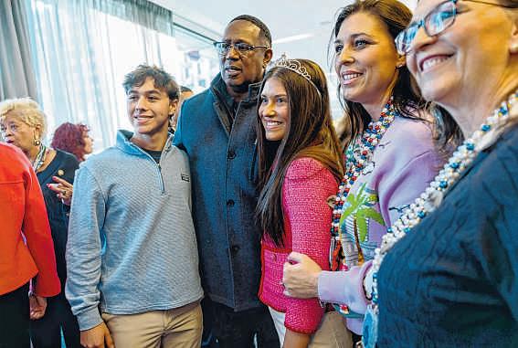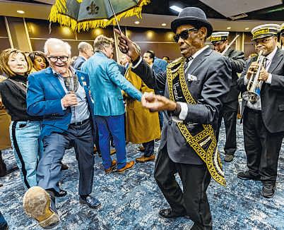 Larry Allen, left, a former Washington Mardi Gras king from 2014, dances to the Treme Brass Band at a reception during Washington Mardi Gras on Friday.
