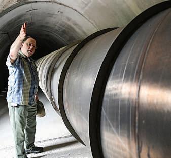 Joseph A. Giaime, observatory head of LIGO Livingston, shows off the 4-kilometer long steel vacuum tubes that are shielded by concrete enclosures.