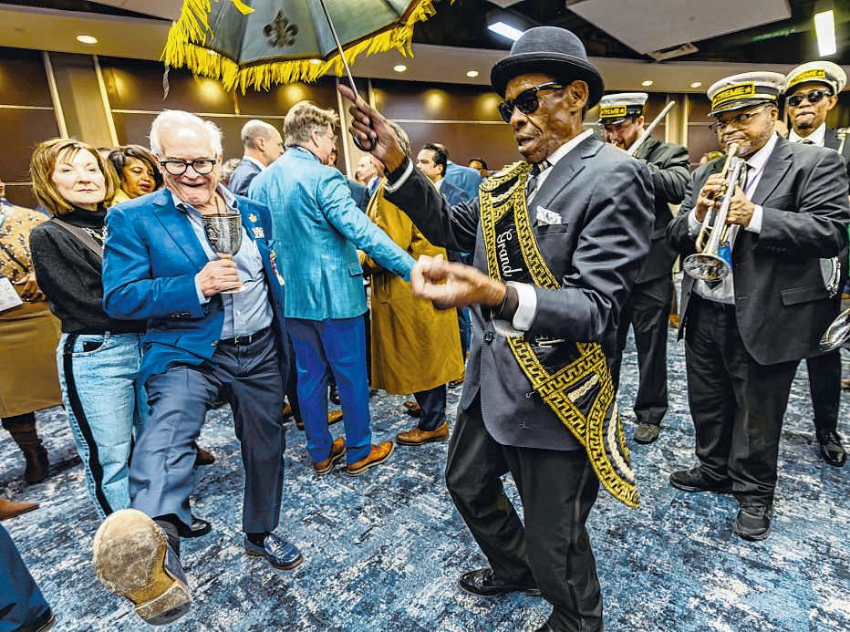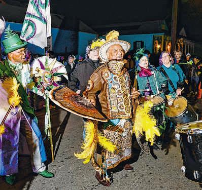 RIGHT: BigChief John Ellis, of the Original Wild TchoupitoulasMardi Gras Indians,sings and dances before the parade on Friday.