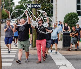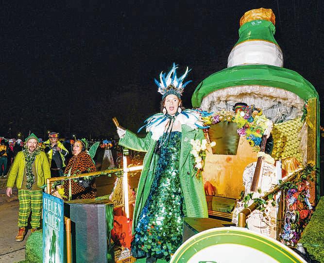 ABOVE: Cellist Helen Gillet dances aboard her float in the Krewe Bohéme parade on Friday. The krewe marched and danced through the Marigny neighborhood andthe FrenchQuarter to the theme, ‘Midnightinthe Garden of Absinthe’ with Gillet asthe Supreme Green Fairy.