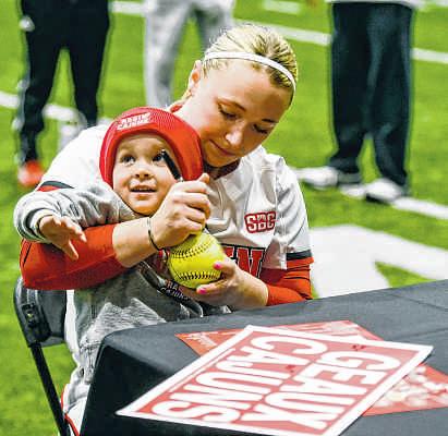ABOVE: University of Louisiana at Lafayette softball coach Alyson Habetz, right, interacts with young fans while signing a poster during the team’s Fan Day inside the Mancla Indoor Practice Facility in Lafayette on Sunday. Fans could get autographs and take photos of the coaches and players. UL softball starts its 2026 season on Friday against Tulsa at Lamson Park.