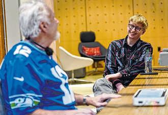 OneCourt founder Jerred Mace, right, talks with Clark Roberts, a blind Seattle Seahawks fan who has had the chance to try out the OneCourt tablet.