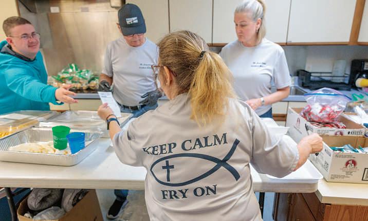 Vidaland RobinMolinario put together trays of friedseafood at St. Joachim Catholic ChurchinMarrero