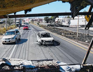 A charred truck blocks a road in Guadalajara, Mexico, on Monday, the day after the Mexican army killed Jalisco New Generation Cartel leader Nemesio Oseguera Cervantes, known as ‘El Mencho.’