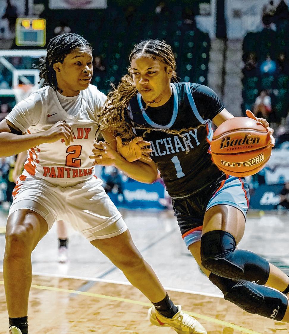 Zachary guard Ava Raymond (1) drives past Parkway guard Khia Thomas (2) in the first period of the 2025 LHSAA Division I nonselect championship.