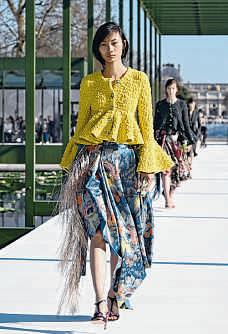 The floral theme was everywhere —but it was developed through silhouette and fabric rather than slapped on literally Crinkled cardigans recalled the corolla of a bloom. Asymmetrically fastened skirts and dresses evoked petals. Even the crystal detailing on embroidered jeans carried a botanical echo. Anderson reprised his Donegal tweed take on the house’slegendary Bar jacket,but made it longer and looser