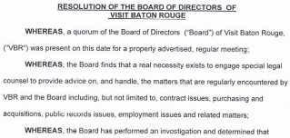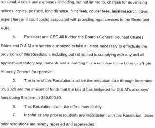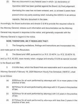 Discussion was held concerning the addition of legal counsel. On amotion by Gary Jupiter,seconded by Rowdy Gaudet the following resolution was approved after arollcall boardvote was held.
