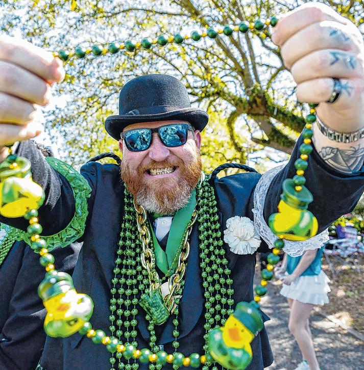 theGreen Parade,leading the procession through the Hundred Oaks neighborhood, South Eugene Street, Terrace Avenue and on to Perkins Road. Along the route, the sharpdressed men pausetohand ladies thetraditional carnations, roses, beadsordoubloons, along with akiss on the cheek. And yes, at some point, theclubdoes do ajig. “I like what we do differently from everybodyelse. We actually getone-on-one with thefolks,” LaPlace said. “So when you walk up to anice lady,you givethem acarnation.That means alot. Youthrow abead to somebody,don’tget me wrong, there’salot of funin that,but youdon’t getthat connection as well.”