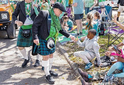 LaPlace pointed out that around 20 of the members are full Irish and dress in kilts designedwiththe tartan representing their ancestors’ county in Ireland. Still other members opt for afull tuxedo rather thanthe wrap-around knee-length kilt which resembles askirt Once they’ve paid their $200 dues, members also receive amedallion, with anew design each year,to wear on their chests on parade day.Smaller doubloons designed similar to the medallions are given out along the route. Both the medallions and doubloons are madelocally by Crown Trophy.The kilts are typicallyordered from Sport Kilt in California.