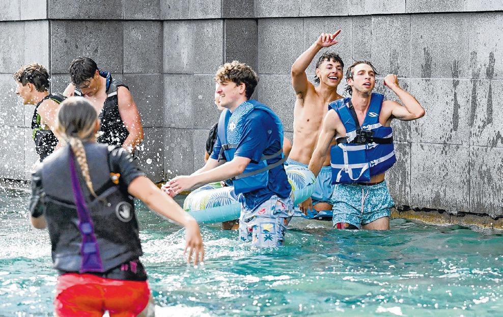 Students hold onto their pool floats as they swim together during the annual end of year East Ascension High School pond jump after seniors finished their final