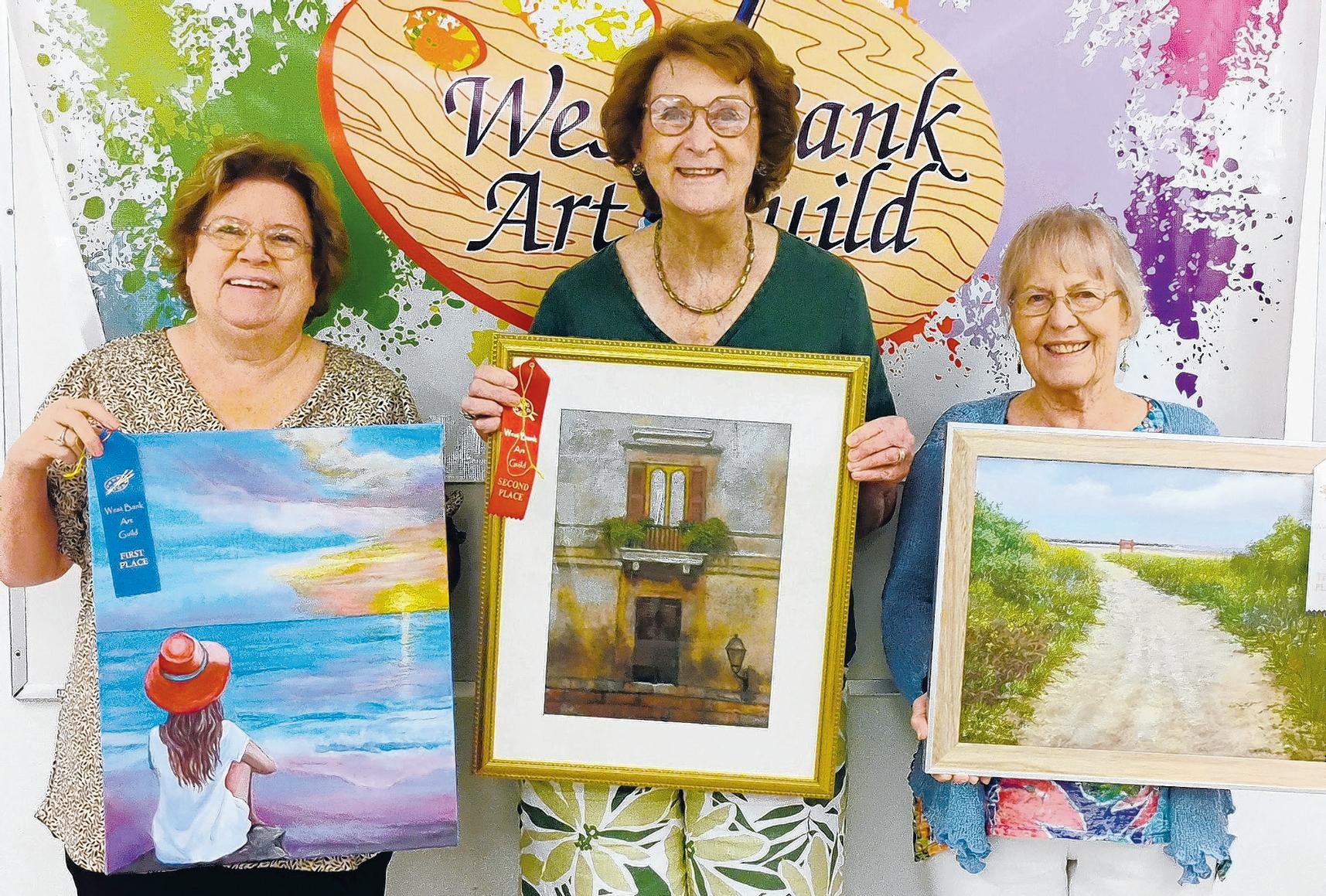 The West Bank Art Guild named its winners in the August 2025 Artist of the Month competition. Shown from left are Regina Roubion, ‘Twilight,’ first place; Darlene Johnson, ‘Window View,’ second place; and Glinda Schafer, ‘Beach Defenses,’ third place.
