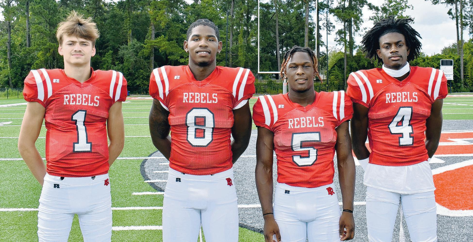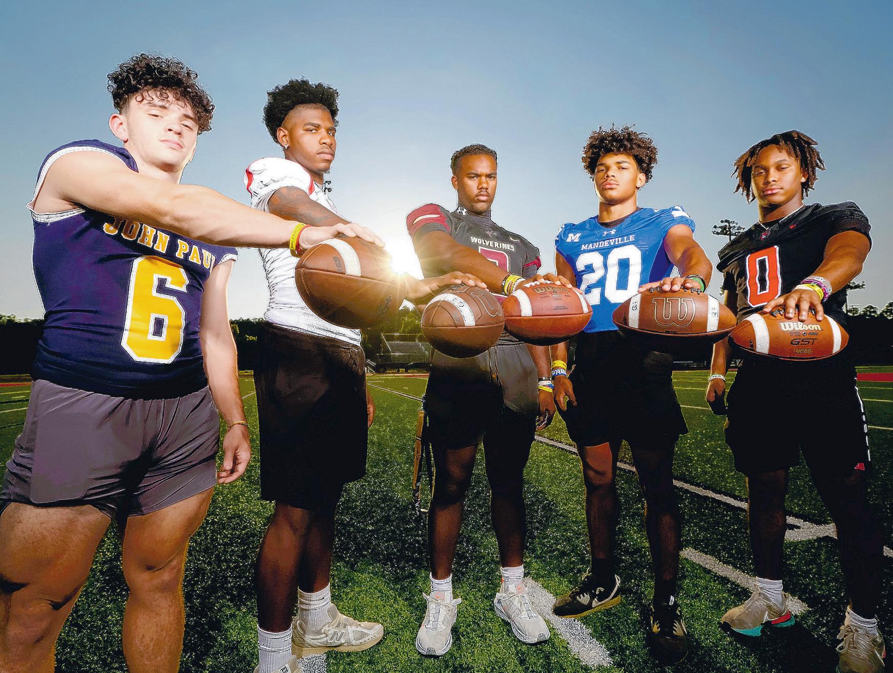 Running backs Dominik Smith, of Pope John Paul II, left; Tashod Badon, of Pearl River; Kameron Casnave, of Northlake Christian; Nate Sheppard, of Mandeville; and Brennan Obey of Fontainebleau, are ready to build on last year’s season success and lead their teams’ offenses in 2024.