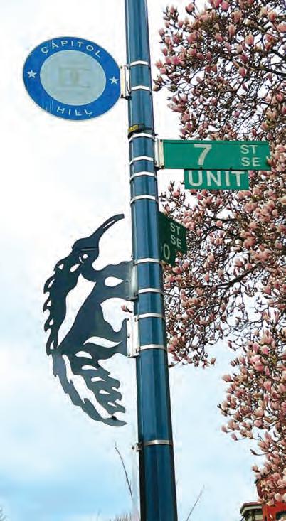 Well, if you’re standing at the corner of Seventh and A Streets SE, we can explain this wildlife sighting. It, and the 19 other animal sculptures affixed to signposts all over the Hill, are part of the Capitol Hill Alphabet Animal Art Project (CHAAP). It all began when Hill resident Stephen Young started walking around with his two young daughters. Passing the lettered street signs, he would say, “E! E is for elephant! K! K is for kangaroo!” And that’s when he had the idea to share the experience by installing sculptures on signposts. He came to the Capitol Hill Arts Workshop