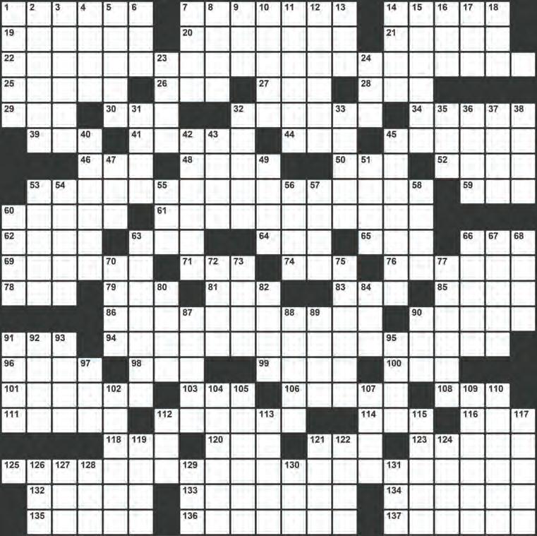 XWORD Across: 1. Scant 7. Short literary or musical composition 14. Syrian president 19. Lilongwe is its capital 20. “A Horse with no name” singers 21. Not tightly defined 22. The inevitable will happen sooner or later 25. Potato press 26. Years on end 27. The Eagles, on a scoreboard 28. Get in a pool 29. Large pond fish 30. Cee follower 32. Famous butler 34. “No bid” 39. Drain 41. Excitement 44. No longer in the service, abbr. 45. Starbucks order 46. Have a title 48. Lost fish 50. Car club 52. Ancient home of Irish kings 53. Repeatedly 59. Talk, talk, talk 60. Hawaiian island 61. Relaxed 62. Part of U.S.N.A., abbr. 63. Bar order 64. Nutritional inits. 65. Egyptian snake 66. 100 lbs. 69. Glum 71. Lord of the ring? 74. Columbus sch. 76. Whodunit awards 78. Night school subj. 79. J.D. holder, abbr. 81. Part of some E-mail addresses 83. Nice nose? 85. Actor Estrada 86. It’s already figured out so you don’t have to ____ wheel 90. Clusters 91. Police announcement 94. Bully 96. Sea foam 98. Fall month 99. Penny-pinching 100. White-ghost fill 101. Type of fever 103. Telesthesia 106. Fancy bathroom fixture 108. Guitar master Paul 111. Bring back to good health 112. “Abracadabra” alternative 114. Car wheel 116. Chicago baseball player 118. Cicero’s 104 120. Nautical affirmative 121. School subj. 123. “Well, ___!” 125. Break in the action 132. 1977 Nobel laureate 133. Repairs a shoe 134. Fifth-century scourge 135. Mythical serpent 136. “Rock-a-bye, baby” spot 137. Was altruistic Down: 1. Simper 2. Backyards 3. “Diary” maker 4. Extinguish 5. Scimitar 6. Employer number, abbr. 7. Waldorf salad ingredient 8. Middle-eastern kingdom 9. Sleep state 10. Black mourning band 11. Choice word 12. On the move 13. Emirates, for short 14. Therapeutic plant 15. Pushover 16. Drunk 17. “Take me __ am” 18. Rep’s opposite “It’s All About the Old Father” by Myles Mellor 23. Smirk 24. Football positions 31. Bart Simpson’s teacher Krabappel 32. “Collateral” star 33. French story 35. Word with stand 36. Words on an Rx 37. Vaccine contents 38. Neb. neighbor 40. Hair dressing 42. Amati of violin-making fame 43. Deal (out) 45. __-faire 47. Chinese river 49. Five-star Bradley 51. Tiny battery 53. Cantina treats 54. To conclude 55. Football org. 56. Within (prefix) 57. Nabokov heroine and others 58. “___ Blue” 60. Emit coherent light 63. Paying the pot 66. Bank 67. Dash off 68. Sounds of disapproval 70. Helgenberger of “CSI” 72. Impose, as a tax 73. Prefix with -graph 75. “__ me, you villain!” 77. Warmly cheerful 80. TV ad-skipping aid 82. Word on a U.S. coin 84. One engaged in, suffix 87. “When pigs fly!” 88. Popular exercise system 89. Asian tongue 90. Gold units, abbr. 91. Part of Nasdaq 92. Kind of platter 93. Winter comment 95. Dossier contents 97. Grafton’s “___ for Fugitive” 102. Sweet stuff 104. Four or six, for example 105. The human soul 107. Eastern prince 109. Cream puff 110. Devious 112. Pipe 113. Little laugh 115. Circumference 117. Get fooled 119. Crumb 121. Aria, e.g. 122. Pointed end 124. “___ smile be your umbrella” 126. “Sorta” suffix 127. Brian of Queen 128. Baseballer Roush 129. Workmanship 130. Thus far 131. Humanities degs. ◆ Look for this months answers at labyrinthgameshop.com 202-544-1059 • labyrinthdc.com Monday – 12pm to 7pm Tuesday, Thursday & Friday – 11am to 10pm Wednesday – 11am to 8pm Saturday & Sunday – 10am to 7pm 645 Pennsylvania Ave. SE (Steps from Eastern Market Metro) • Educational, board and party games • LEGO and other building toys • Chess & other strategy games • Jigsaw puzzles • Brainteasers • Marble mazes • Corporate gifts; and much, much more! LET OUR A-MAZE-INGLY KNOWLEDGEABLE STAFF HELP YOU GIVE FUN TO EVERYONE ON YOUR HOLIDAY LIST. Shop online or in-store. We are shipping anywhere in the U.S. E ASTOFTHE R IVER DCN EWS COM 46