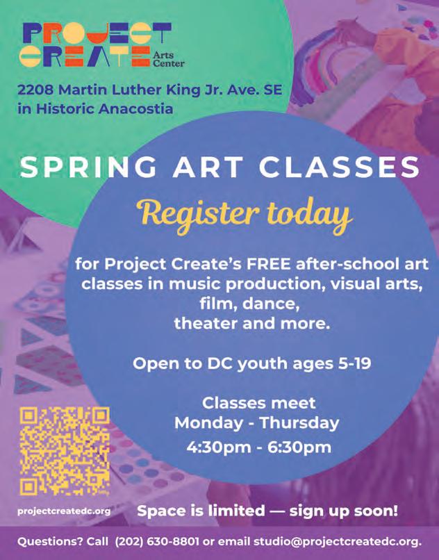For more than 30 years, Project Create has facilitated free, multidisciplinary workshops and classes for kids and adults that use the therapeutic power of creativity to heal, teach and empower. Their spring semester commences February 9, and features digital art classes, music and live sound engineering, improv theater techniques and mural classes. Register your little ones now. @projectcreatedc. 2208 Martin Luther King Jr Ave SE