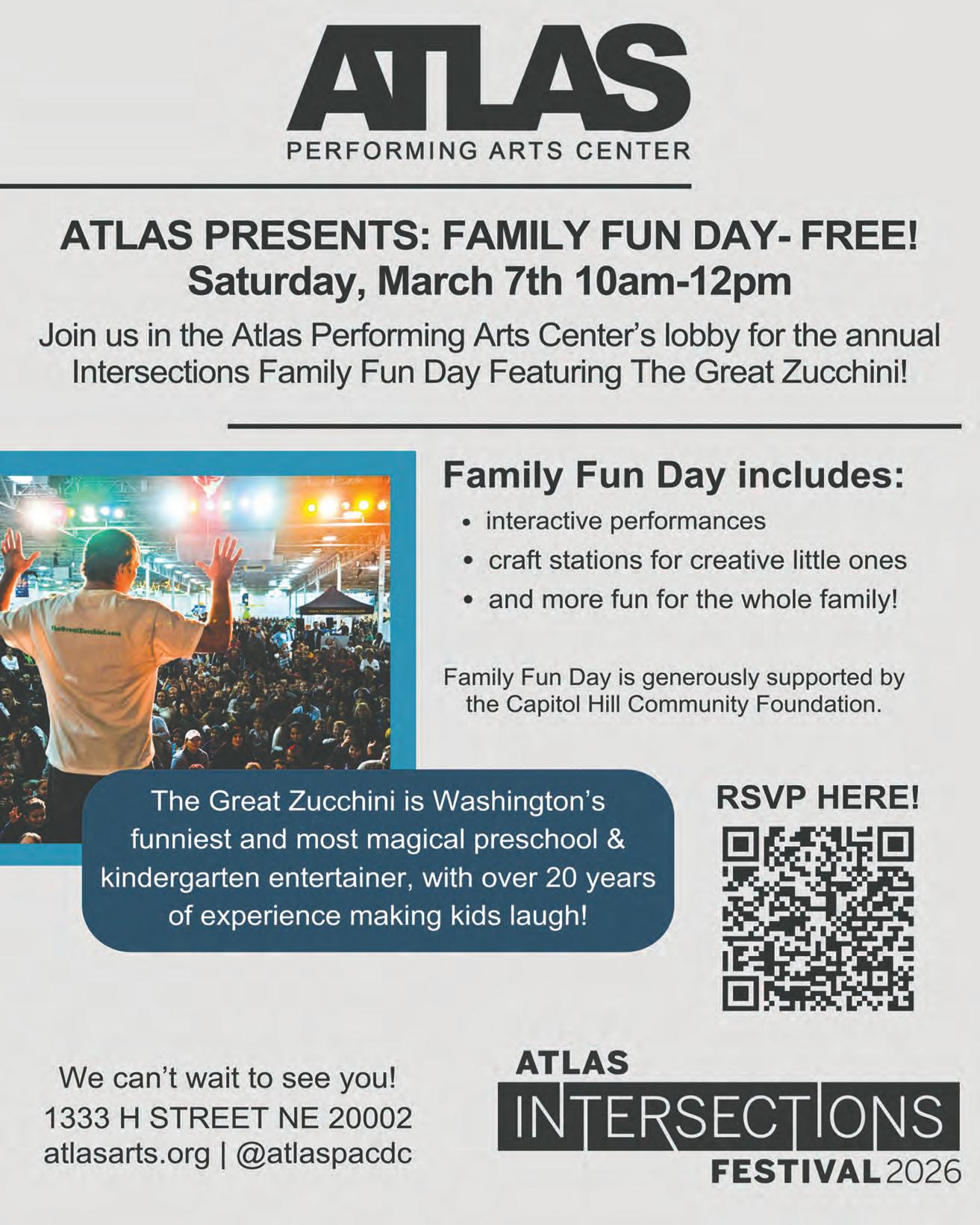 On Sunday, Feb. 15, noon to 6 p.m., enjoy the second annual Mardi Gras on H Street. Here’s the Main Stage, 1207 H St. NE, lineup: noon, Eastern High School Blue and White Marching Machine and DC Warriors Drumline; noon to 1 p.m., Line Dancing; 12:15 p.m., Drum-off; 2 p.m., US Army Blues Band; 4:30 p.m., Capitol Hillbillies; noon to 4 p.m., moon bounce and face painting. The Atlas lineup: 1:30 p.m., Good Life Theater Puppet Show; 2:30 and 7:30 p.m., Dracula (family-friendly matinee); 6 p.m., Glade Dance Collective. More music on H Street lineup: 3 to 4 p.m., Line Dancing at AVEC, 901 H St. NE; 4 to 7 p.m., Live Music at Henceforth, 1335 H St. NE; and 4 to 7 p.m., Johnny Graves & Piano at O Street Gallery, 1354 H St. NE.