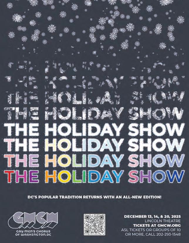 e Cathedral Choral Society’s “Joy of Christmas” performances at the National Cathedral are always on our itinerary for December. is year, music director Steven Fox’s holiday program includes the Eastern Senior High School’s Concert Choir, Mary La Blanc on percussion (she’s a sta sergeant for the United States Marine Band), the all-female Seraph Brass group, fresh o a recent tour with pop singer Adele, and Edward M. Nassor playing the cathedral’s Kibbey Carillon, which was installed in the 1960s, 150 feet above the nave. e program includes seasonal sing-along favorites like “Silent Night,” “O Come All Ye Faithful” and “Hark, the Herald Angels Sing,” plus J.S Bach’s “Ach mein herzliebes Jesulein,” “Brich an, O schoenes Morgenlich” and other joy- lled compositions. Just what’s needed to close out 2025. ◆