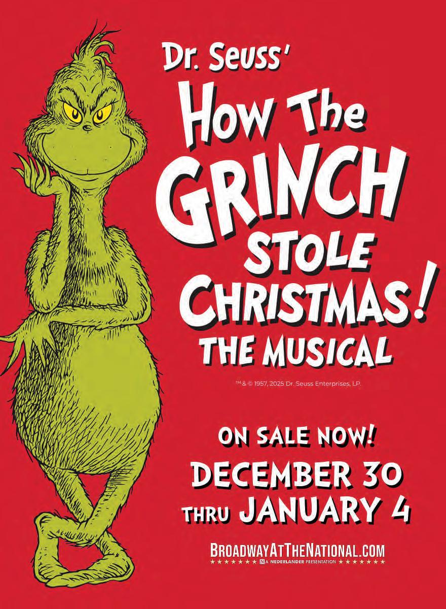 “How the Grinch Stole Christmas!The Musical” Dr. Seuss’ “How the Grinch Stole Christmas! e Musical” is a Broadway holiday production that features hit songs like “You’re a Mean One Mr. Grinch” and “Welcome Christmas” from the original animated special. Sets and costumes inspired by Dr. Seuss’ original illustrations capture the true meaning of the holiday season. “How the Grinch Stole Christmas! e Musical” is at the National eatre, 1321 Pennsylvania Ave. NW, from Dec. 30 to Jan. 4, 2026. www.thenationaldc.com