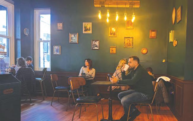 Ensconced in a small rowhouse, warm yellow and green walls adorned with art and a half dozen simple tables give the café a light and airy feel. One of the front windows hosts a perfect nook for nishing a paper or reading a book. A massive glass case displays all the establishment’s dangerous confections, behind which sits a high-end espresso machine.