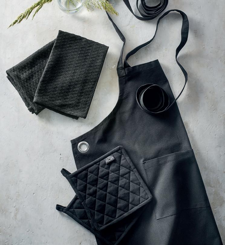 Lekkert forkle, 2 kjøkkenhåndlær og 2 grytekluter fra Pillivuyt, i svart bomull/polyester. Svært god kvalitet. Kan vaskes på 40 grader.