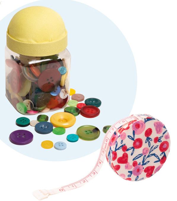 Små og store knapper i ulike farger er fine å ha for hånden til pynt, øyne eller som knepping. Målebånd som går opptil 60 tommer og 150 centimeter. Trykk på midten, så snurrer målebåndet seg inn i en fei.