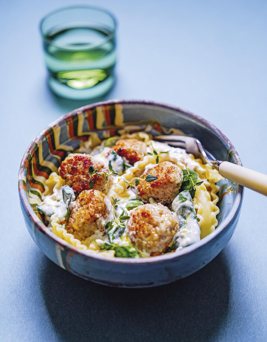 Slipp spinat i pannen og rør inn rett før servering. Tilsett kjøttbollene og dryss over litt timian.