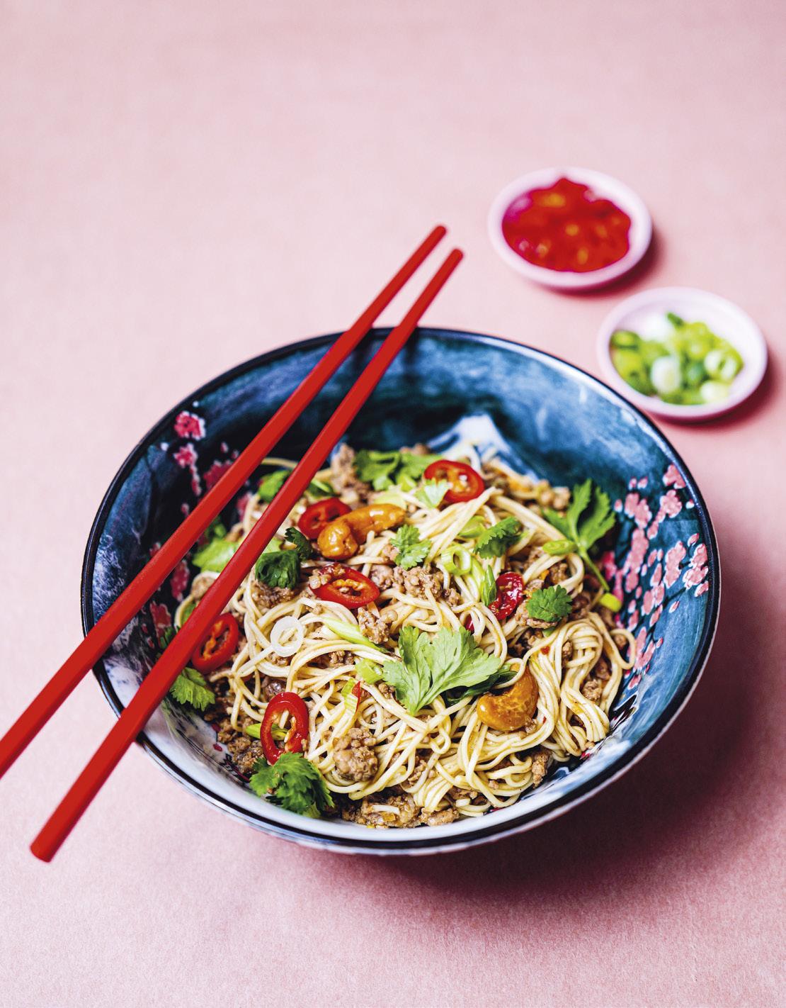 Vend nudlene i pannen. Bland inn resten av chilien og cashewnøttene, og strø over vårløk og korianderblader.