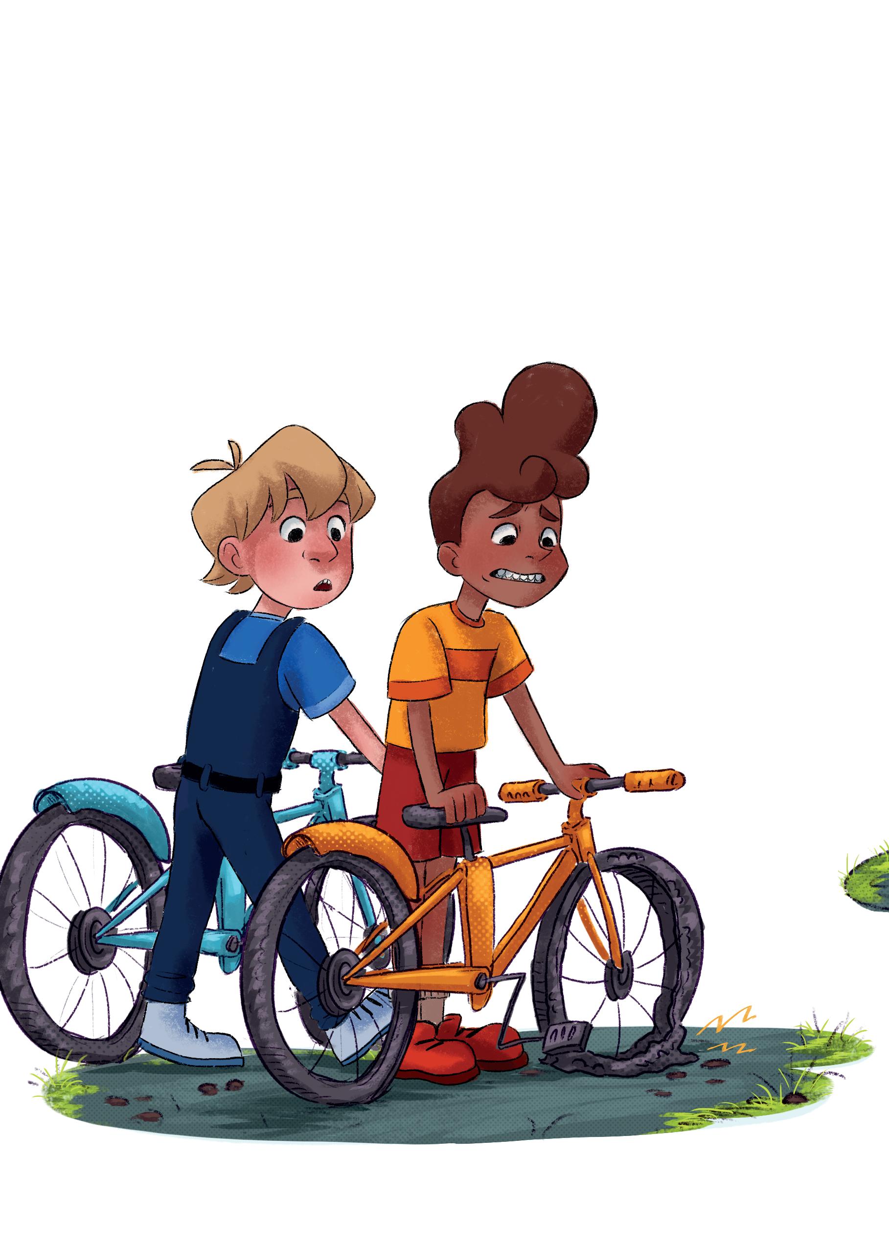 – Are you all right?! asks Henry. Elvis spits out pebbles and pats his body to check that nothing is broken. The front wheel is flat. OH NO!