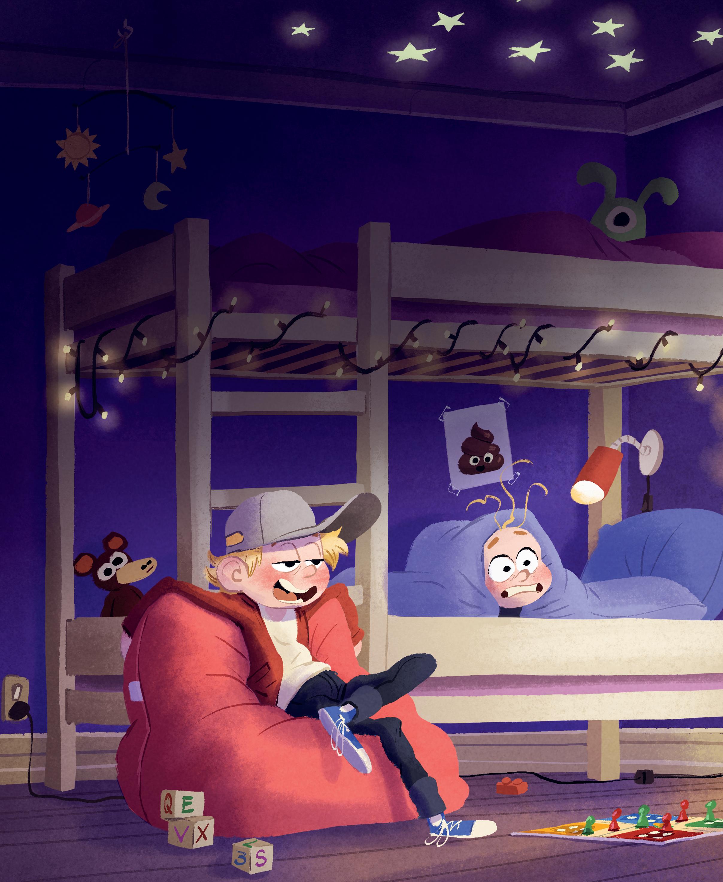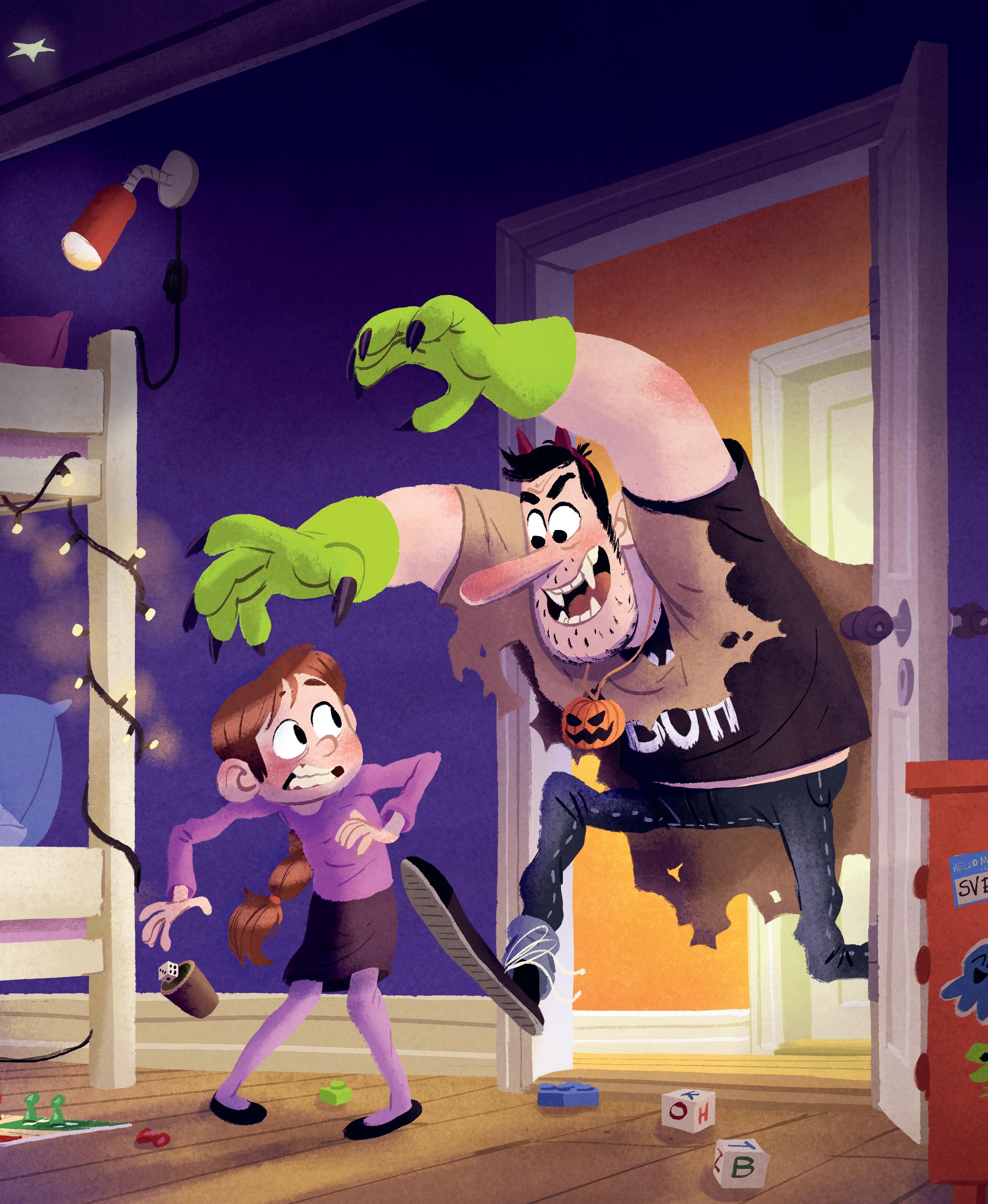 Plutselig slås døra opp med et smell, og et skummelt monster braser inn i rommet.