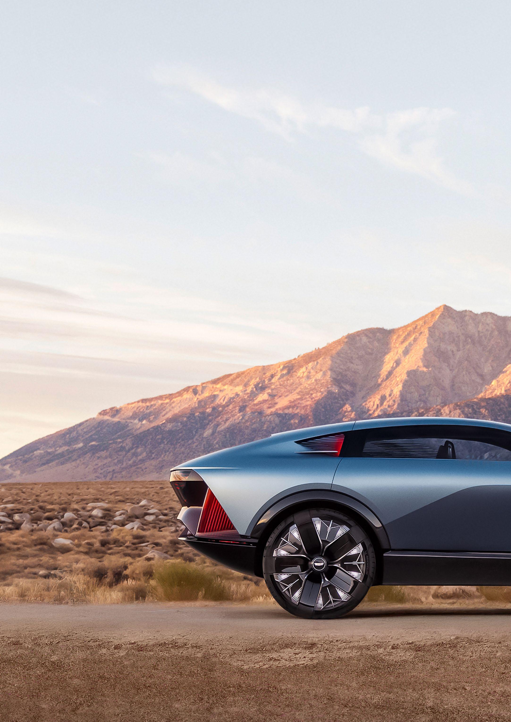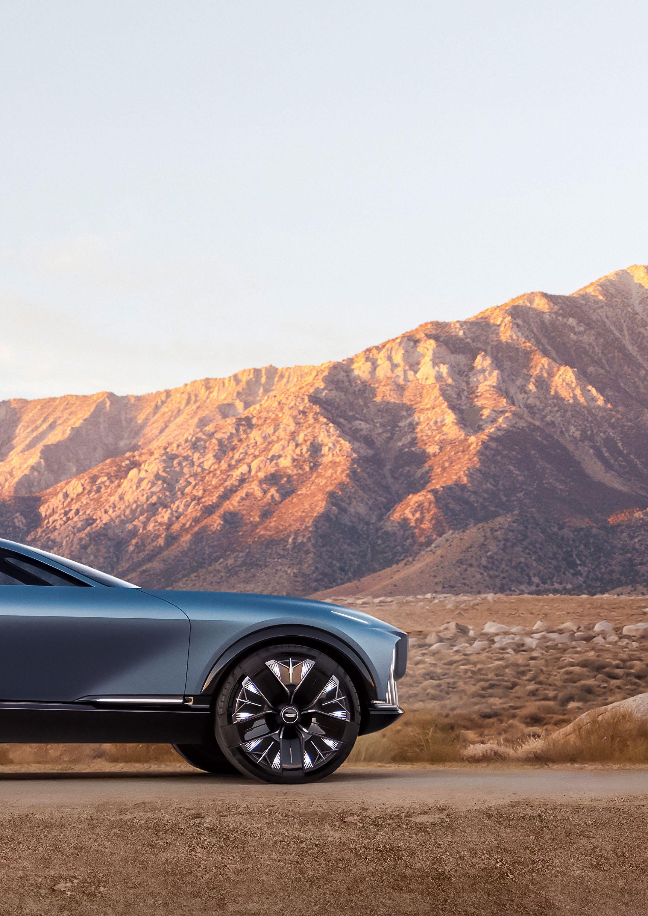It’s a taller, off-road version of its Opulent counterpart. It’s sleek, with a fastback roofline and a raked windshield. The bonnet is long, though the weight sits over the rear axle. The front echoes Cadillac’s current grilles, the headlights are right out at the sides and there are crystalline LEDs that give it a science-fiction look. The rear has fluted LED taillights and yet more futuristic LED decorations behind a glass tailgate.